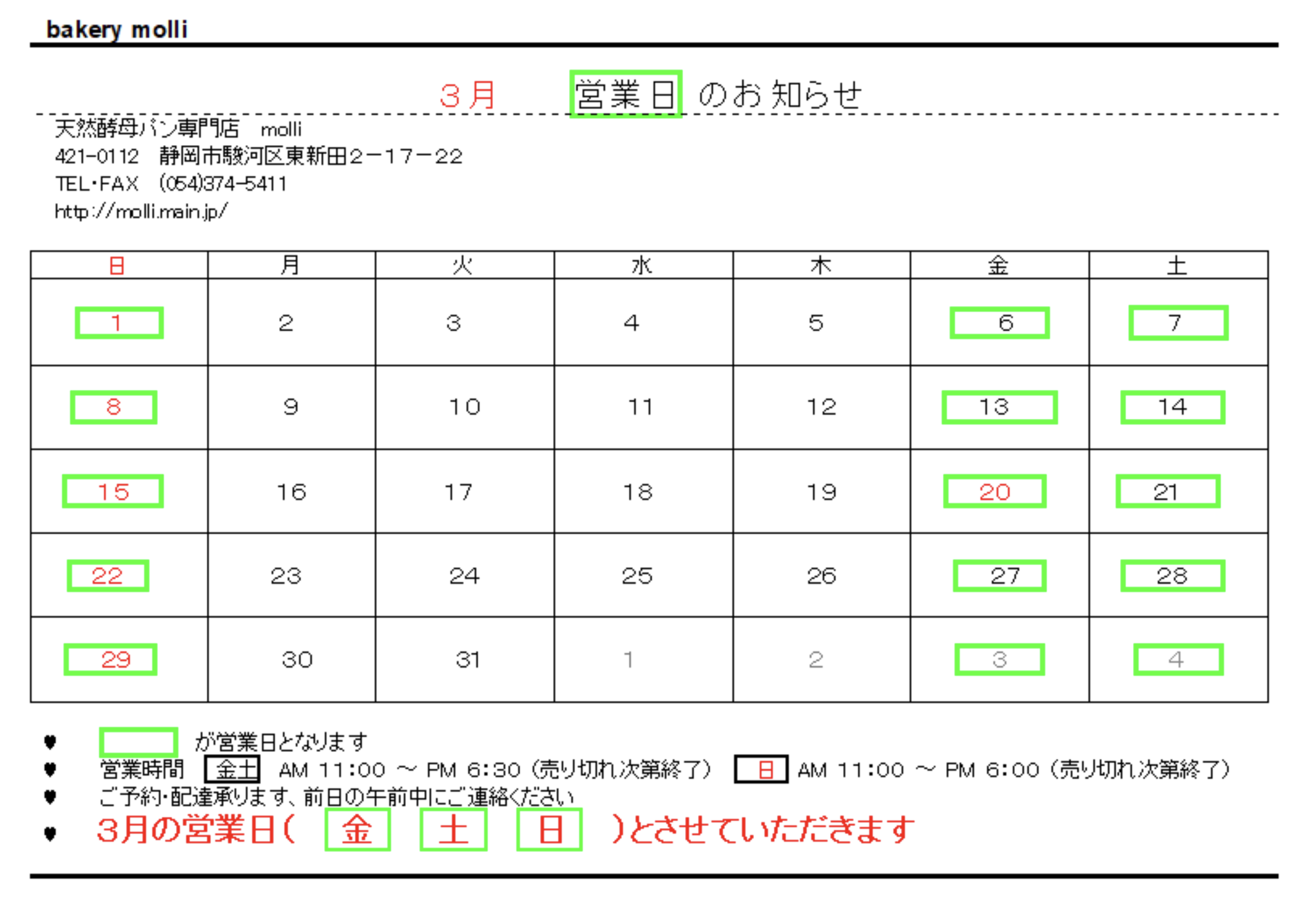 molli では、『あこ天然酵母』(小麦粉と米を使って培養、化学物質を使用しない)を使い、良質小麦、洗双糖、自然塩など、材料にこだわって、天然酵母パンを焼いています。(イーストフード、添加物、冷凍生地などは一切使用していません)